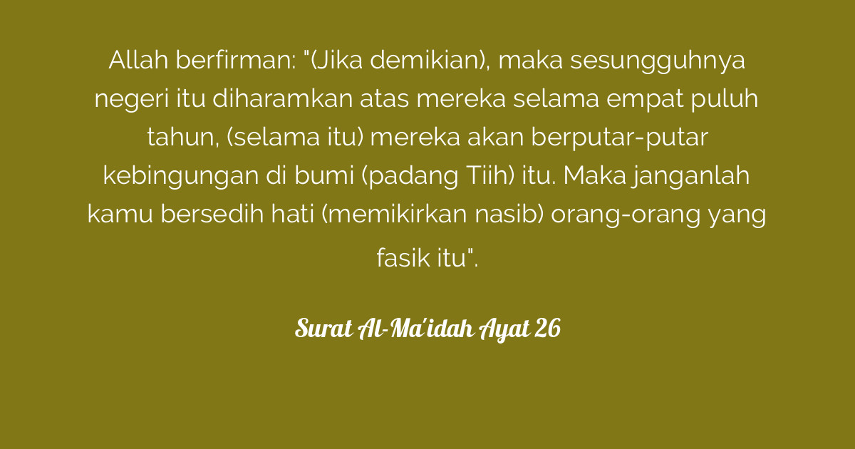 Baca al maidah ayat 26 This is QS 526 english translate. Arabic Text Urdu and English Translation From Kanzul Iman. Allah said then that land is forbidden to them for forty years let them wander in the land. Lihat juga:maidah dan al maidah ayat 26 Al Maidah is 5 surah chapter of the Quran with 120 verses ayat.